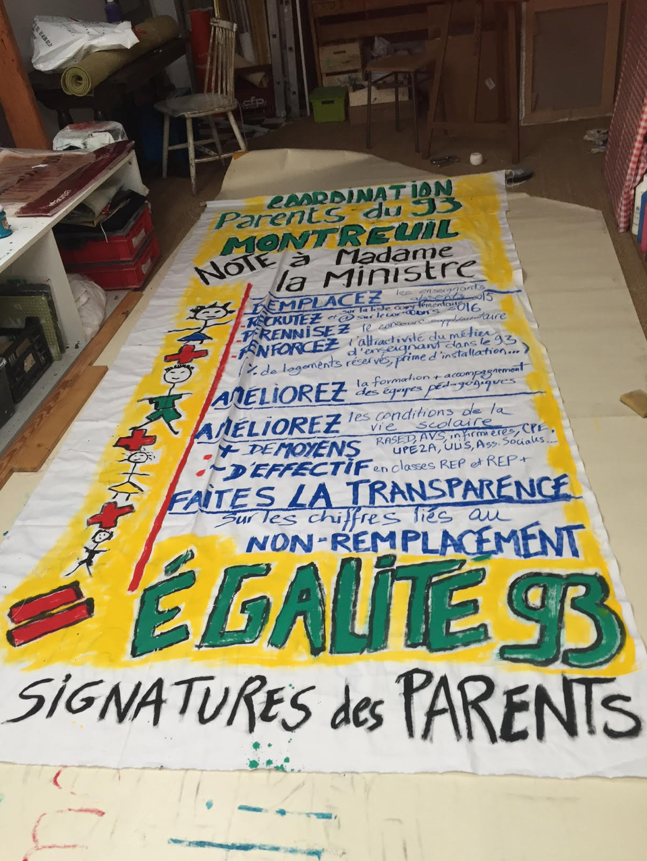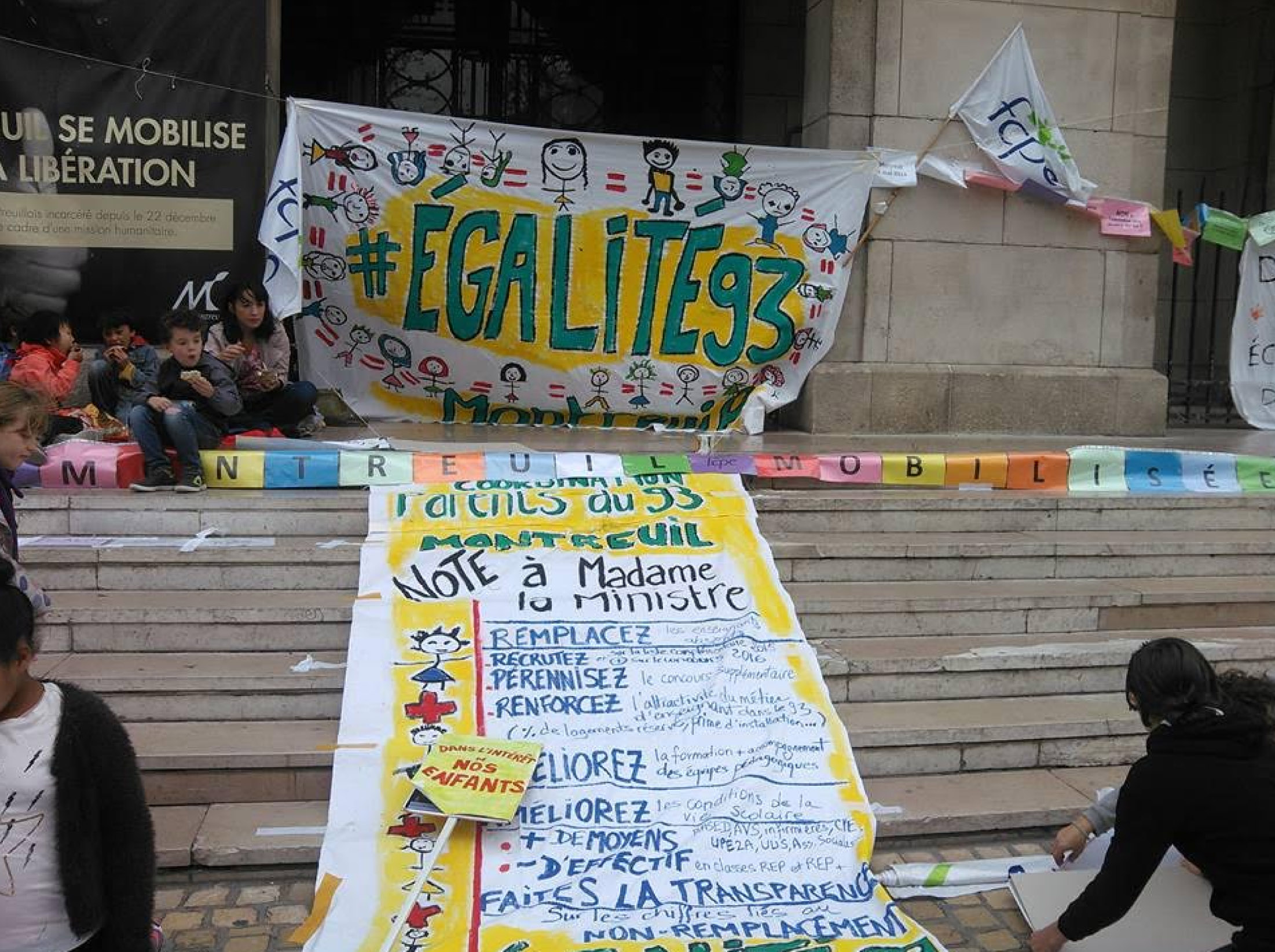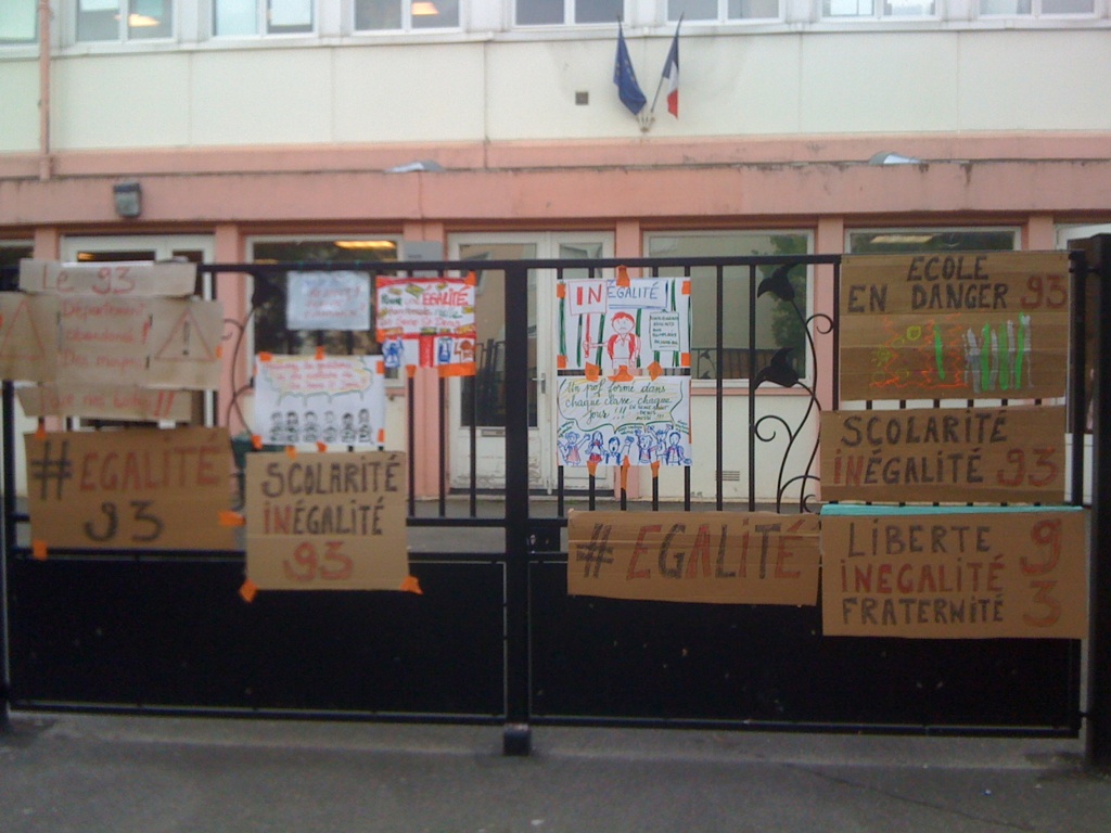 Ce mercredi 18 mai 2016, les parents ont occupé les bureaux de direction, ont masqué le mot « ÉGALITÉ » inscrit devant leurs écoles, ont affiché banderoles et dessins autour de l’« #ÉGALITÉ93 »…